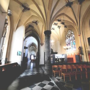 La lourde porte s’est refermée sur notre siècle et nous faisons un bond dans le passé, au temps du gothique. La perspective sur la voûte du XVe siècle est unique. Une forêt de colonnes, à perte de vue ! Pas de chapiteau, juste des colonnes avec un encadrement duquel partent en hauteur tous les arcs brisés qui soutiennent la voûte. La cathédrale possède deux trésors : l’hostie qui saigne de Viversel (voir la légende du XIVe s. de l’hostie miraculeuse) et les 47 crânes-reliques de l’abbaye de Herkenrode (voir la légende liée à Sainte Ursule).