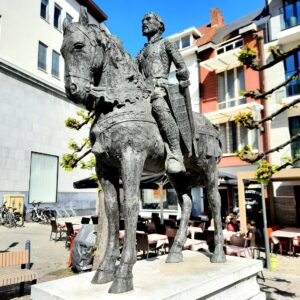 Sculpture en bronze de Marc Cox à la Fruitmarkt : le comte Arnoul IV de Looz (Graaf van Loon) qui, en 1232, après avoir confirmé le statut de « cité » d’Hasselt, en fit la capitale économique et administrative du comté. Et dans son développement, la ville a tiré profit de sa proximité avec le château comtal et avec l’importante abbaye de Herkenrode à Kuringen.