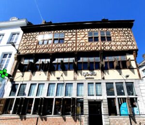 Une maison à ne pas rater, au coin de la Kapelstraat : témoignage de l’art mosan, elle porte des colombages en croix de Saint André et à l’angle du 2e étage, une main gantée brandit une épée ! Impressionnant !