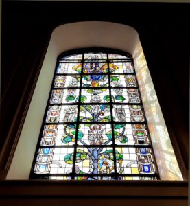 Ce superbe vitrail aux couleurs vives est la représentation schématisée et présumée de l’arbre dit « généalogique » de Jésus de Nazareth, tel qu’apparaissant dans les Ecritures, et remontant jusqu’à Marie de Nazareth qui y figure avec Jésus à son sommet. Et c’est de Jessé, père du roi David, roi d’Israël et ancêtre de Jésus, que l’arbre s’élève, symbolisant la lignée à la fois royale et divine de Jésus et sa nature humaine. Voilà pourquoi le nom de Jessé a été attribué à la Vierge Marie, Virga Jessé, exprimant son rattachement à cette lignée. La boucle est bouclée !