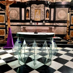 Ce maître-autel du sculpteur liégeois, Jean Del Cour (sa maison natale existe encore aujourd’hui au n°4 de la rue Gilles Del Cour à Hamoir) est une splendide représentation de l’art baroque mosan qui s’impose par ses ors, son ivoire et son marbre derrière le nouvel autel, ultra moderne, dont l’entablement est soutenu par sept losanges en verre – que l’artiste a conçu dans un style épuré et léger contrebalançant l’imposant autel baroque en arrière-plan.