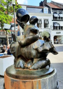 En effet, la drêche du grain distillé servait de nourriture aux bœufs et aux porcs dont le fumier engraissait le sol sablonneux campinois et faisait pousser les céréales, matière première du genièvre. Et le cycle recommençait ! Toute la ville est ainsi « animée » par de nombreuses statues personnalisant les quartiers de façon ludique pour souligner des éléments du passé. La place de l’art dans tout Hasselt est exceptionnelle ! Et si c’était cela qui rend les gens heureux ?