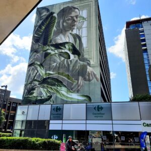 Juste face à nous ! L’œuvre est monumentale ! Sam Bates, un artiste australien, alias Smug, a représenté une jeune femme de sa connaissance, sur 450 m² de surface sur un immeuble à appartements. Dans des couleurs végétales, elle nous apparaît gracieuse, céleste, mais aussi, si réelle que nous ne pouvons la quitter du regard. Personne n’ose bouger, quand quelqu’un crie : « Je l’ai trouvée ! Je l’ai trouvée ! La noisette ! ».