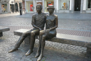 Ou, comme ce couple assis sur une des nombreuses banquettes de la place qui nous invite au repos : « Hallo, nous sommes Hendrik et Katrien, le légendaire premier couple d’habitants. C’est le sculpteur hasseltois Marc Cox qui nous a donné la vie en 1989. En regardant au loin, vers le futur, nous symbolisons la jeunesse tournée vers l’avenir. Restez assis avec nous encore un moment pour écouter le carillon ! C’est d’ailleurs le nom donné à notre statue ».