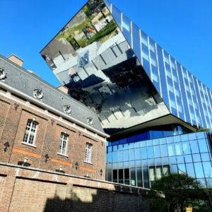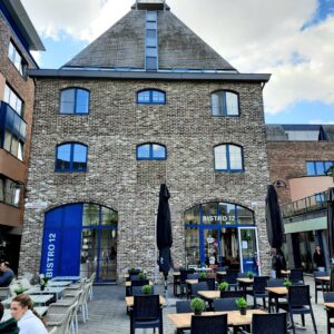 ‘t Scheep a ouvert ses portes en 2018, après trois ans de travaux. Une réalisation architecturale exceptionnelle : 17 000 m² de surface, l’hôtel de ville s’élève sur sept étages et est relié à la caserne de la gendarmerie restaurée, située à gauche, par une connexion en verre qui « jette littéralement un pont entre l’ancien et le nouveau ». C’est sa façade-miroir oblique, où la rue s’y reflète, qui a été une des plus spectaculaires réalisations du bureau d’architecture de Michel Janssen (de Tongres) & Partners. Un incroyable défi à toutes les lois de la pesanteur terrestre ! Quelle réussite totale !En quittant la Groenplein, c’est la Dorpstraat qui nous fait découvrir un petit village dans la ville comme si nous posions le pied dans un monde poétique surgi du passé et si bien incarné par le poète médiéval Hendrik van Veldeke, né vers 1128, près d’Hasselt. Il fut au service des comtes de Loon et de Mayence, entre autres.