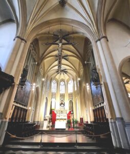 La lourde porte s’est refermée sur notre siècle et nous faisons un bond dans le passé, au temps du gothique. La perspective sur la voûte du XVe siècle est unique. Une forêt de colonnes, à perte de vue ! Pas de chapiteau, juste des colonnes avec un encadrement duquel partent en hauteur tous les arcs brisés qui soutiennent la voûte. La cathédrale possède deux trésors : l’hostie qui saigne de Viversel (voir la légende du XIVe s. de l’hostie miraculeuse) et les 47 crânes-reliques de l’abbaye de Herkenrode (voir la légende liée à Sainte Ursule).
