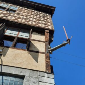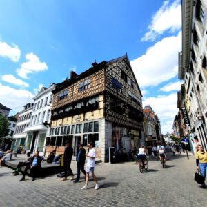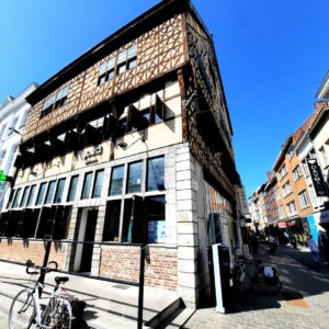 Une maison à ne pas rater, au coin de la Kapelstraat : témoignage de l’art mosan, elle porte des colombages en croix de Saint André et à l’angle du 2e étage, une main gantée brandit une épée ! Impressionnant !