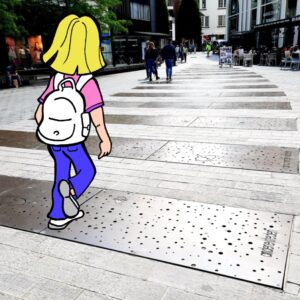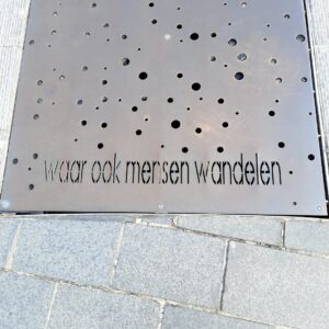 Nous tombons immédiatement sous le charme de cette petite place. Et en y regardant mieux, nous constatons qu’elle est, en partie, recouverte de plaques métalliques en bronze.