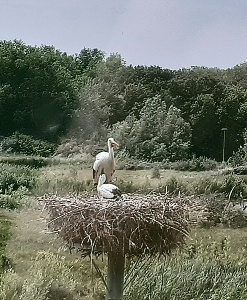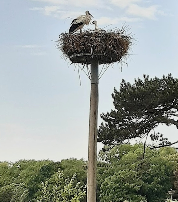 Nous avons commençé par les salles didactiques qui détaillent la riche faune de la réserve. La promenade extérieure s’est déroulée ensuite depuis une hutte verticale qui permet de découvrir les premières cigognes nichant dans des nids surélevés. Le premier nid observé était occupé par un couple d’habitués qui comptent 22 et 23 ans d’âge, ils renoncent à émigrer l‘hiver et s’occupent aujourd’hui d’un jeune. Alternativement le père et la mère surveillent et couvent le petit, l‘autre adulte part chercher de la nourriture qu’il avale et régurgite au retour sous forme de bouillie dont raffole le petit. D’autres nids sont habités par des cigognes qui reviennent des pays chauds en mars, avril, elles repartent dés le mois d’août vers la France, l‘Espagne ou le Maroc. Certaines cigognes restent en Espagne et y trouvent leur nourriture.