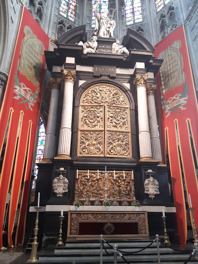 La cathédrale contiguë comprend le chœur, ceinturé d’une galerie, dont le maître-autel en marbre noir et blanc a été réalisé par Luc FAYD’HERBE au XVIIe siècle. La chaire de vérité monumentale en bois de style baroque est l’œuvre d’un sculpteur anversois, Michel VAN DE VOORT (1667-1737). Cet artiste a réalisé le mobilier baroque des principales églises de Flandre.